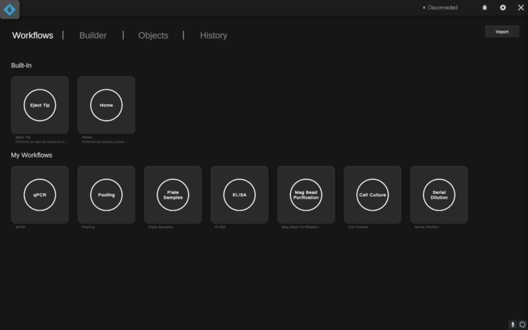 - Predefined Workflows: Save time and streamline processes with access to a library of commonly used pipetting protocols directly within the app.